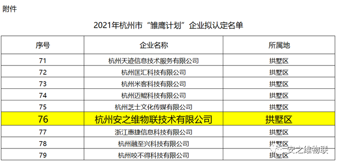 杭州市科学技术局公布了《2021年杭州市“雏鹰计划”企业拟认定名单》,杭州安之维物联凭自身科技实力成功入选。